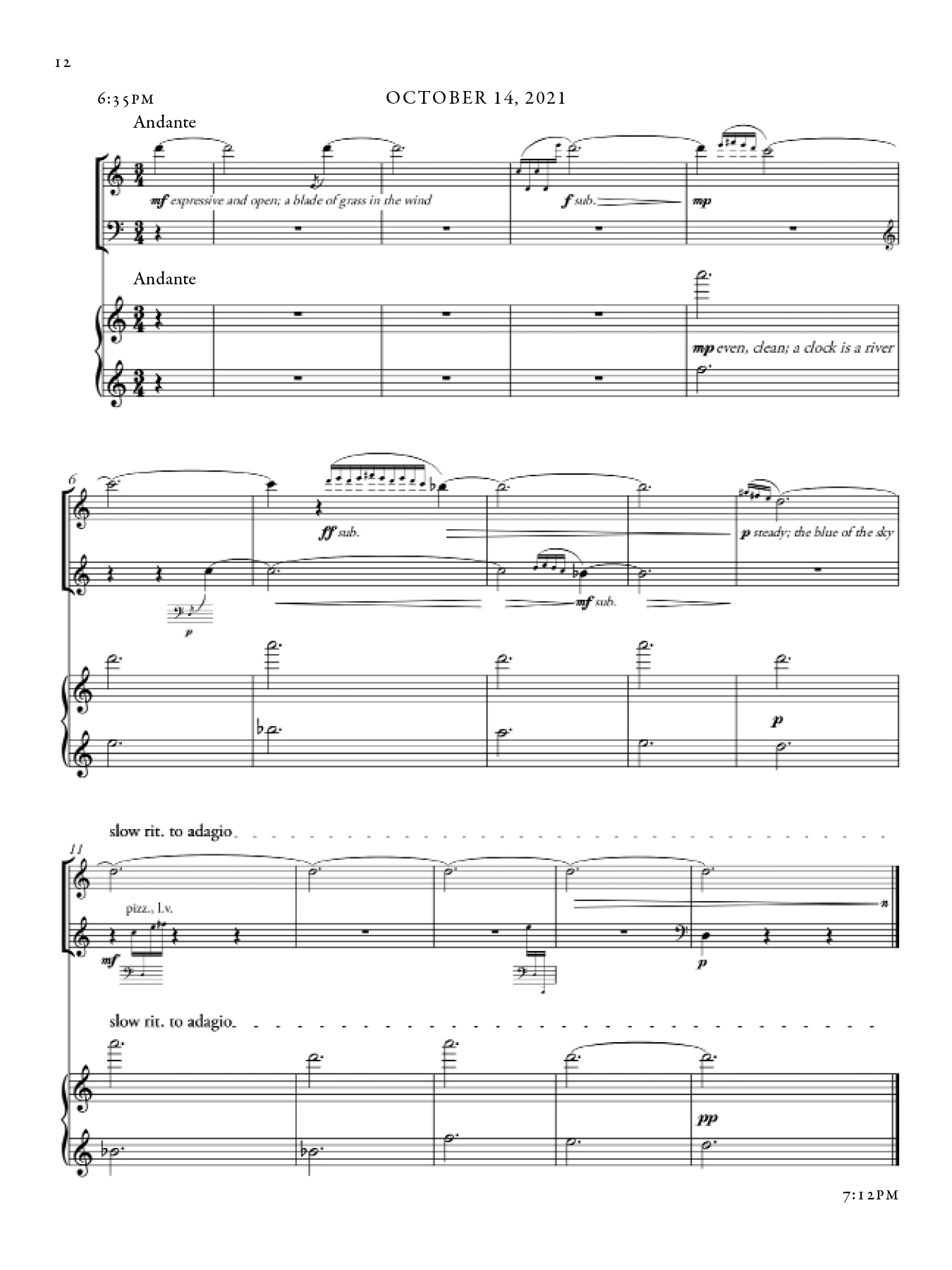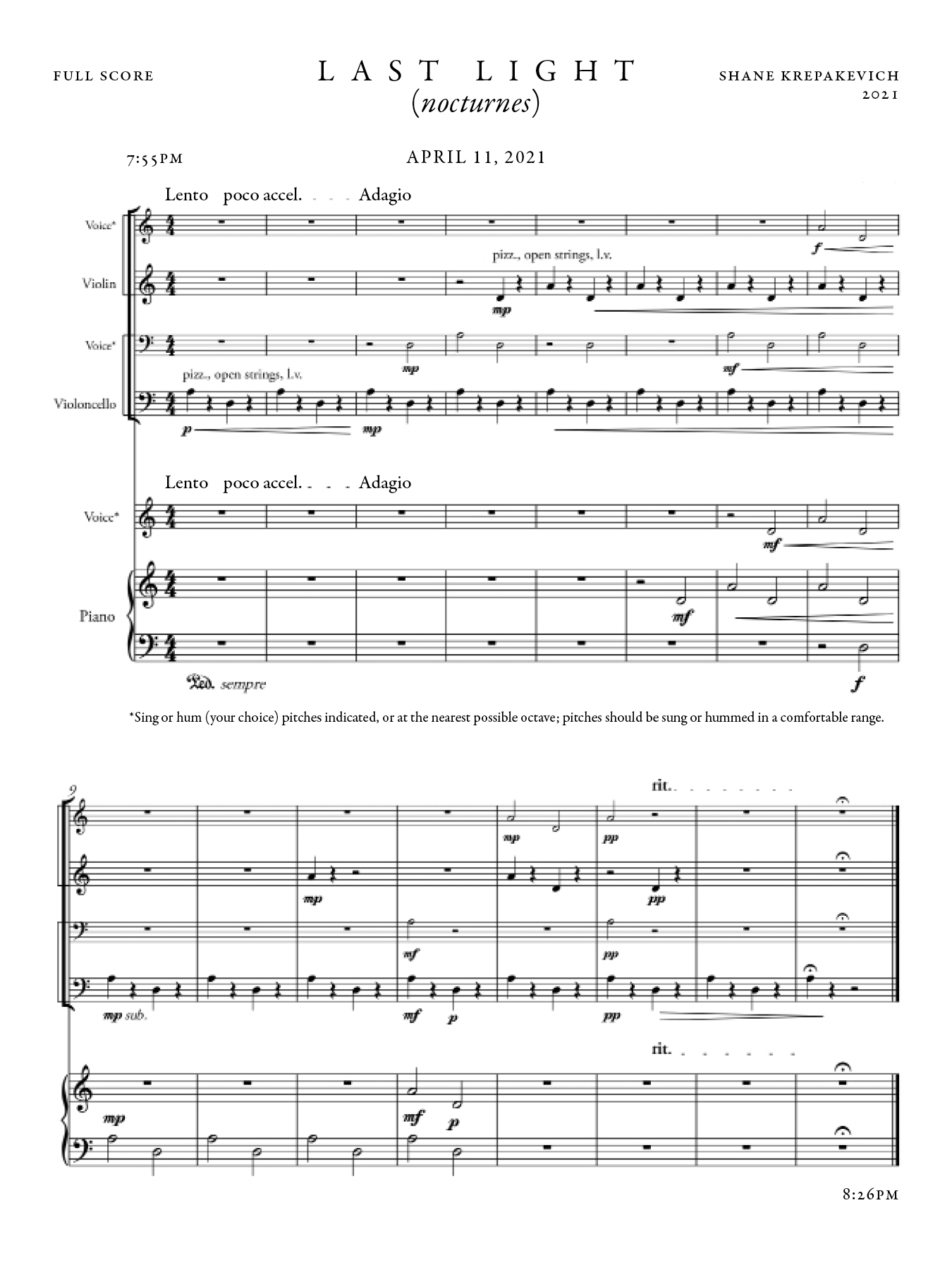 Most nocturnes depict the night; these nocturnes document it. On eleven evenings, from April through October 2021, I started composing the minute the sun set. I stopped when there was no light left in the room. The music is exactly as written on those eleven evenings – no revisions, no edits.
