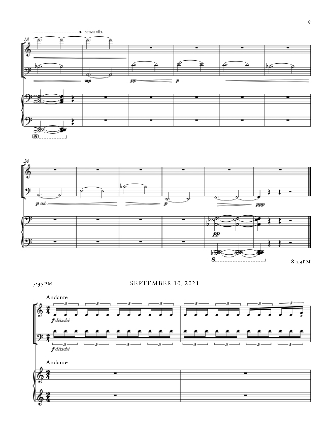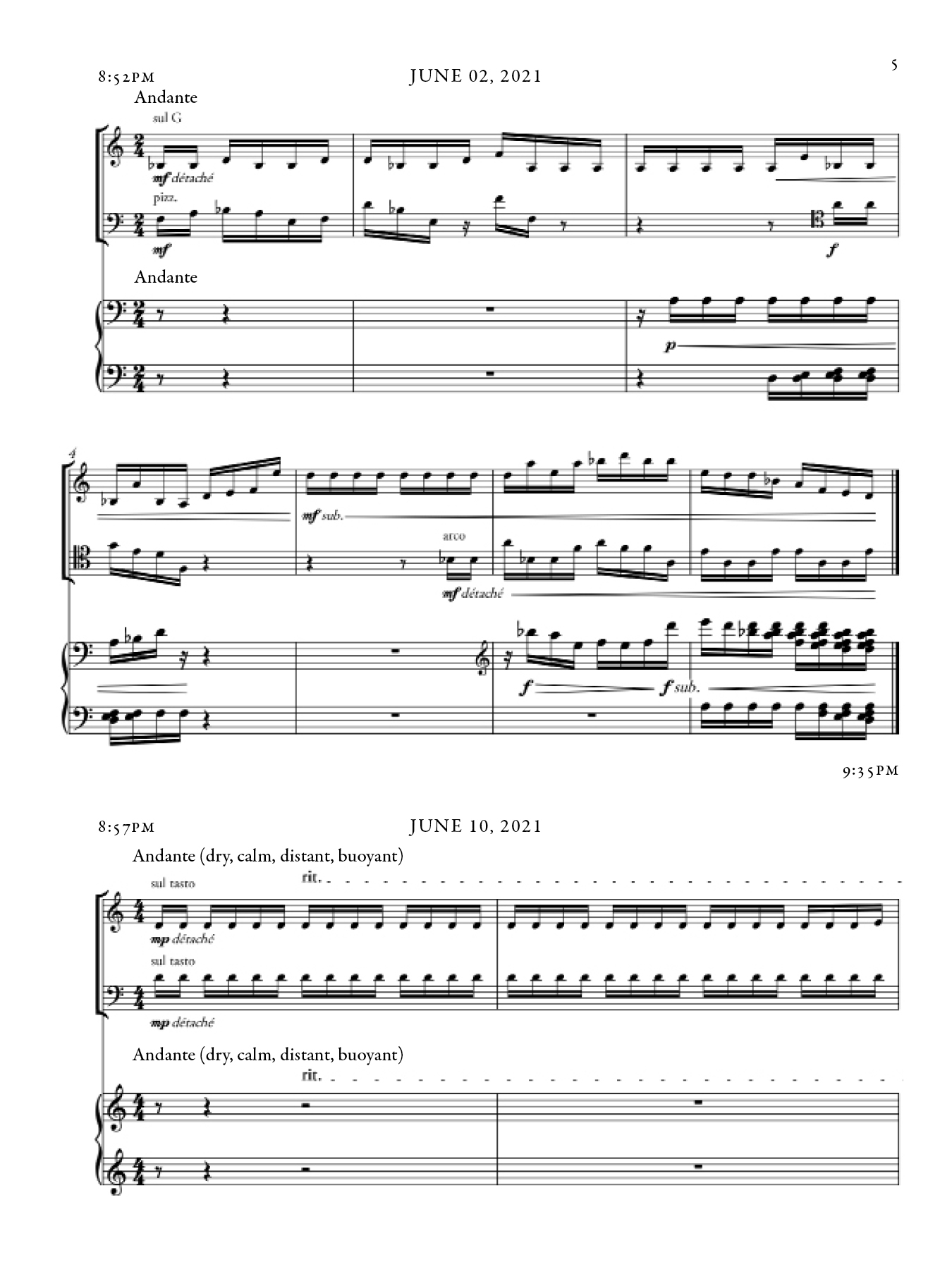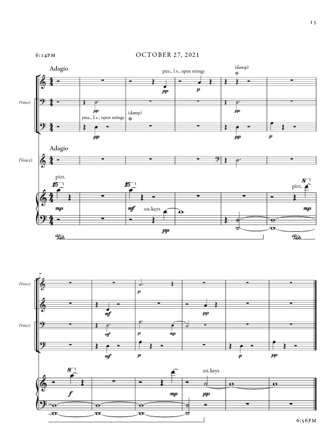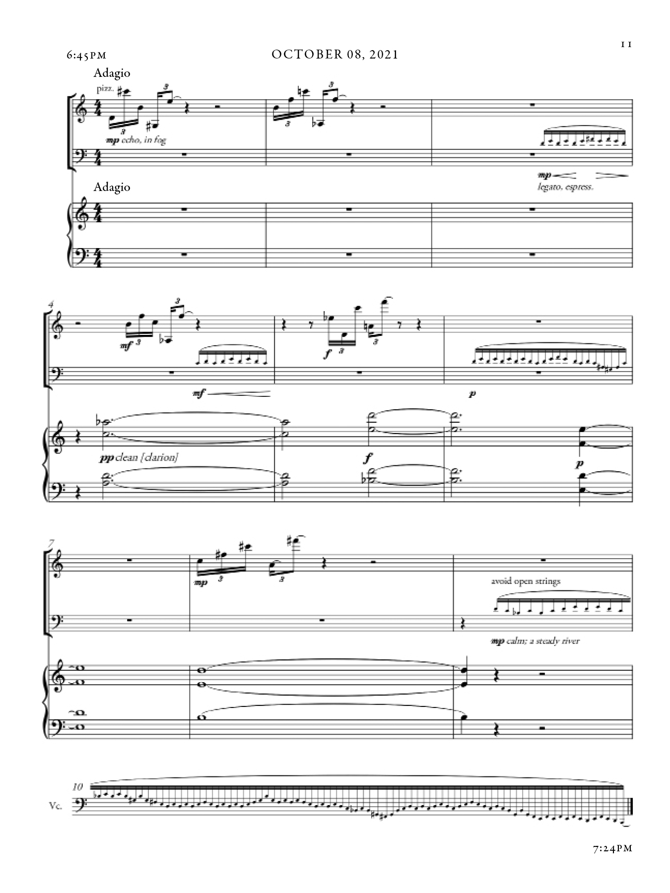 Each section of this piece shifts in character, as a reaction both to the night during which it was composed as well as my awareness of the existing sections up until that point. There are however common musical materials that draw throughlines across sections, from the beginning to the end of the piece. The music took inspiration from that of Marin Marais, traditional Japanese Koto music, and Olivier Messaien's Quatuor pour la fin du temps.