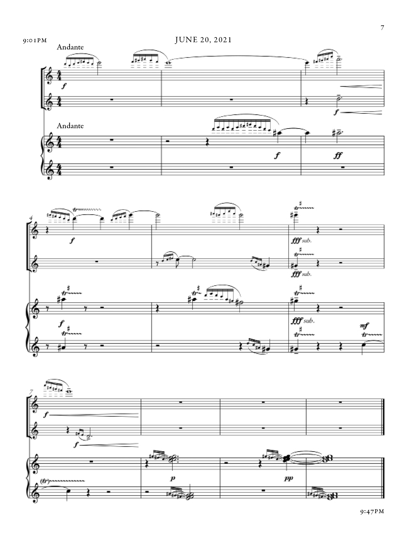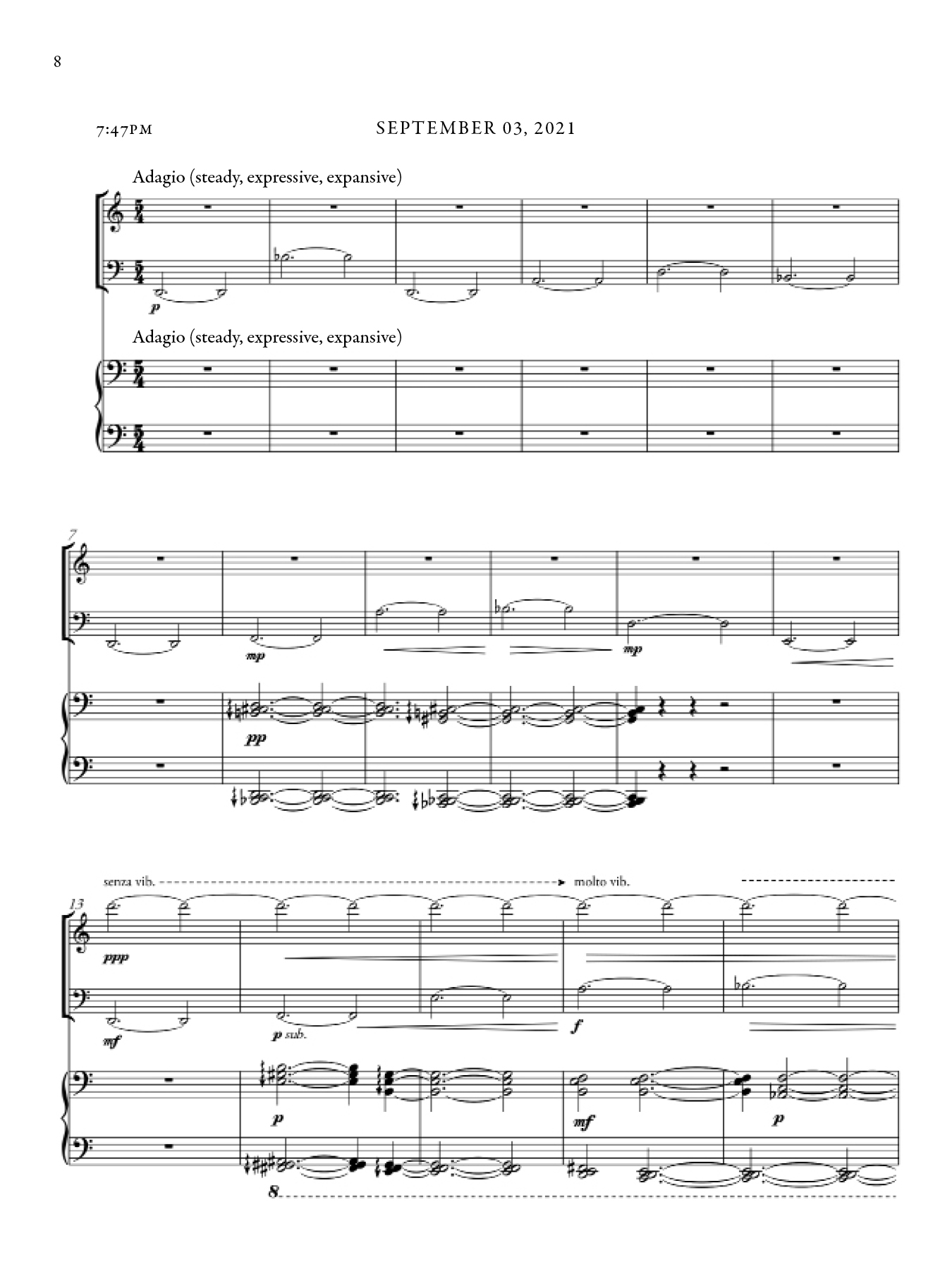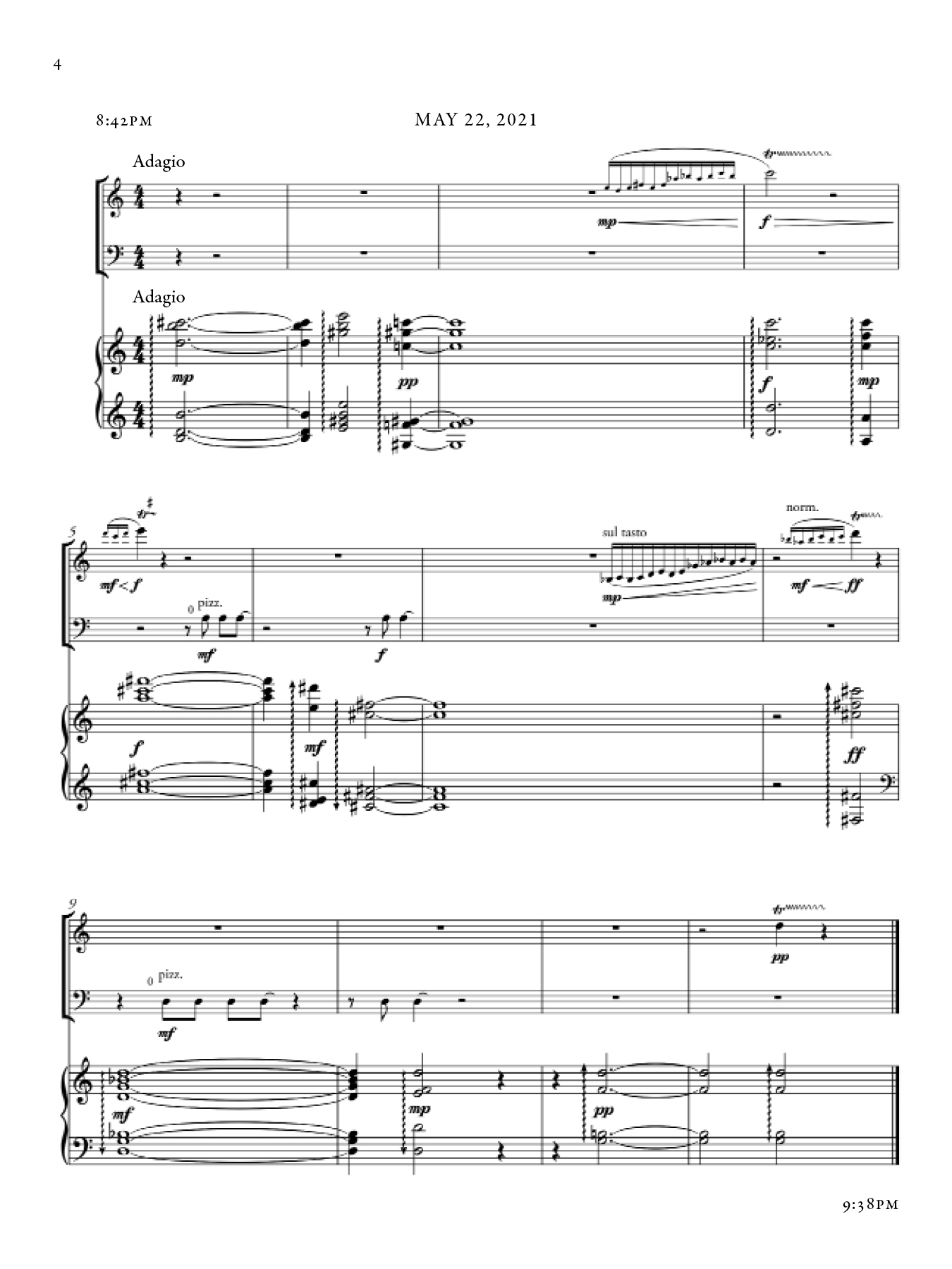 Each section of this piece shifts in character, as a reaction both to the night during which it was composed as well as my awareness of the existing sections up until that point. There are however common musical materials that draw throughlines across sections, from the beginning to the end of the piece. The music took inspiration from that of Marin Marais, traditional Japanese Koto music, and Olivier Messaien's Quatuor pour la fin du temps.