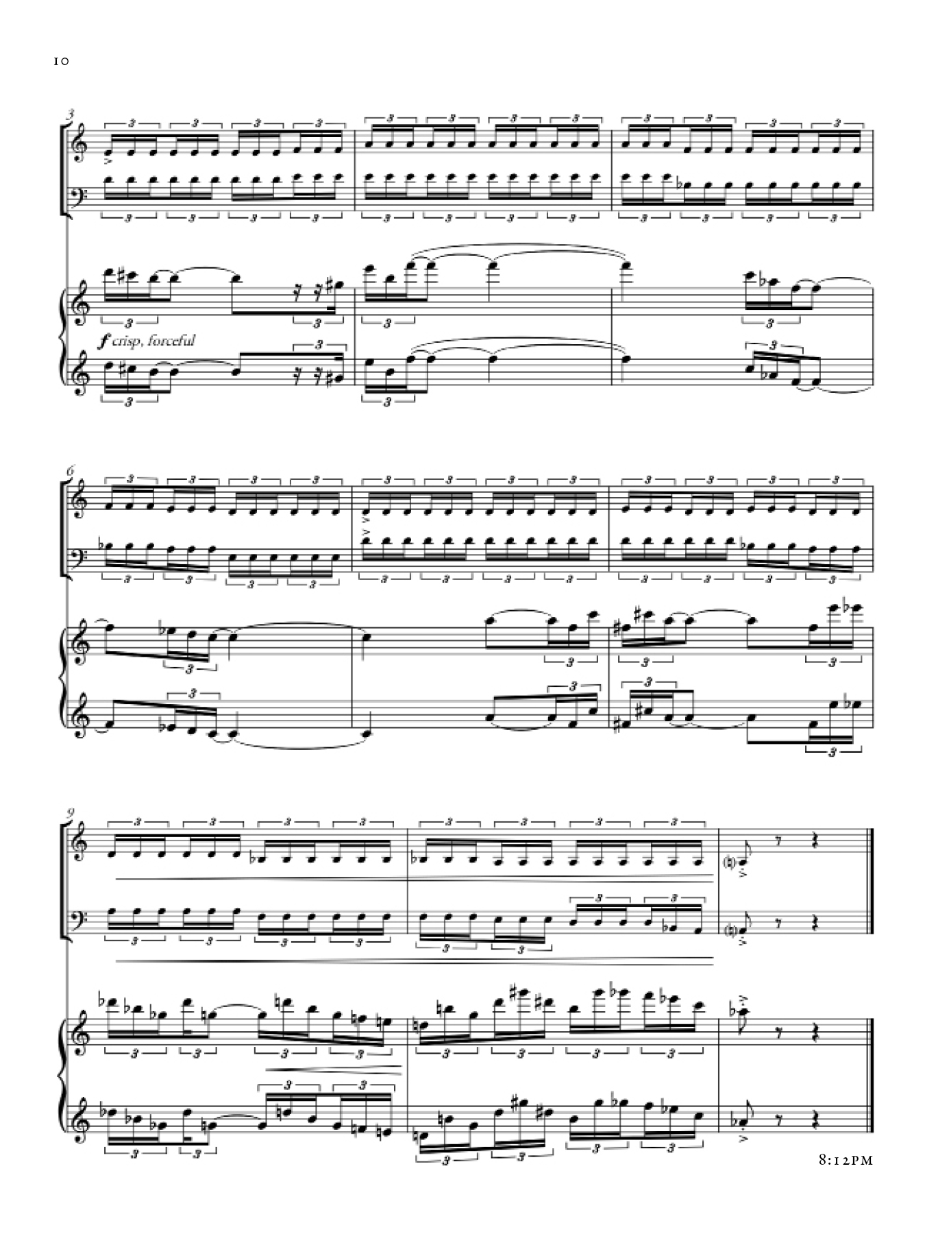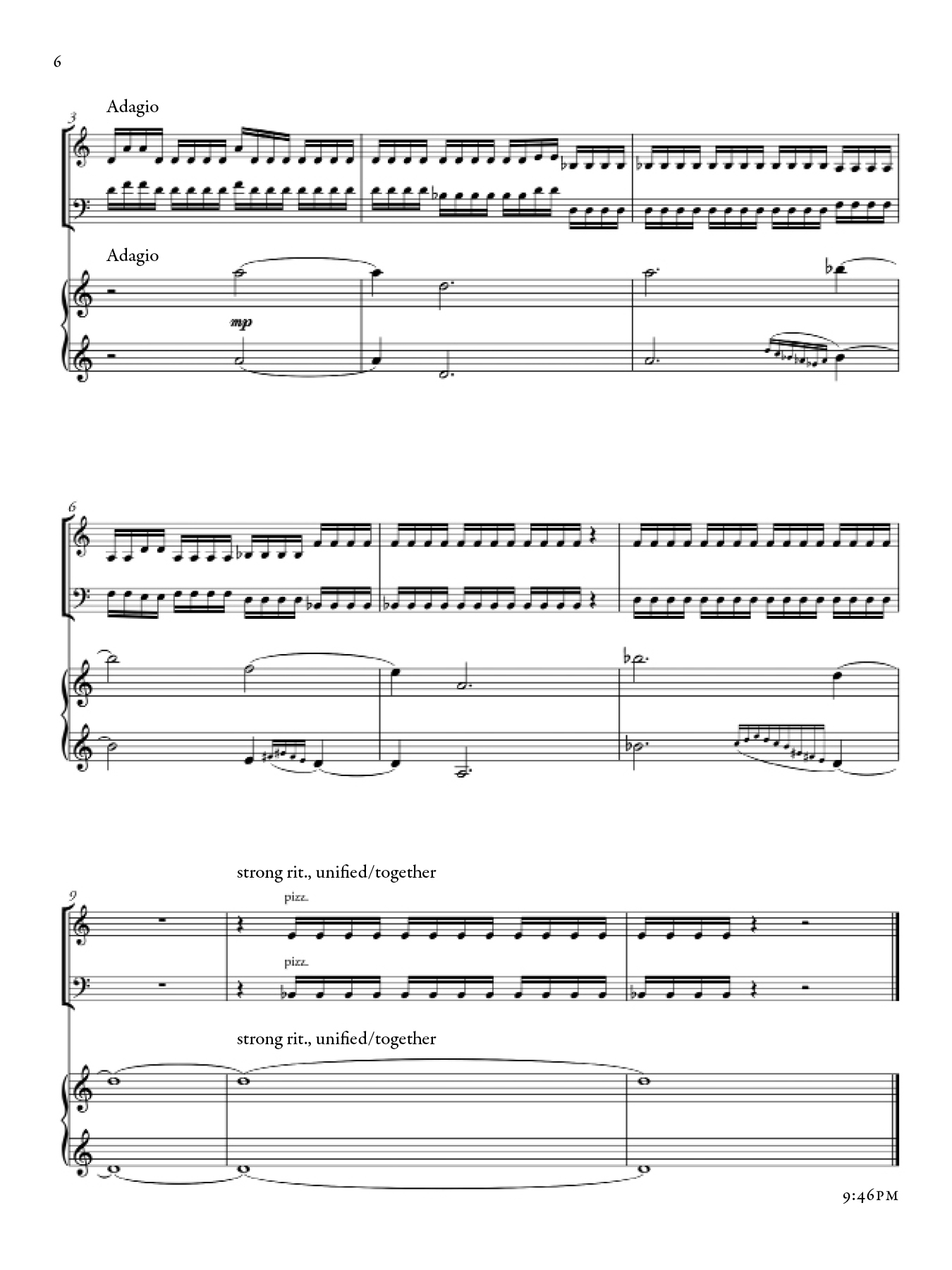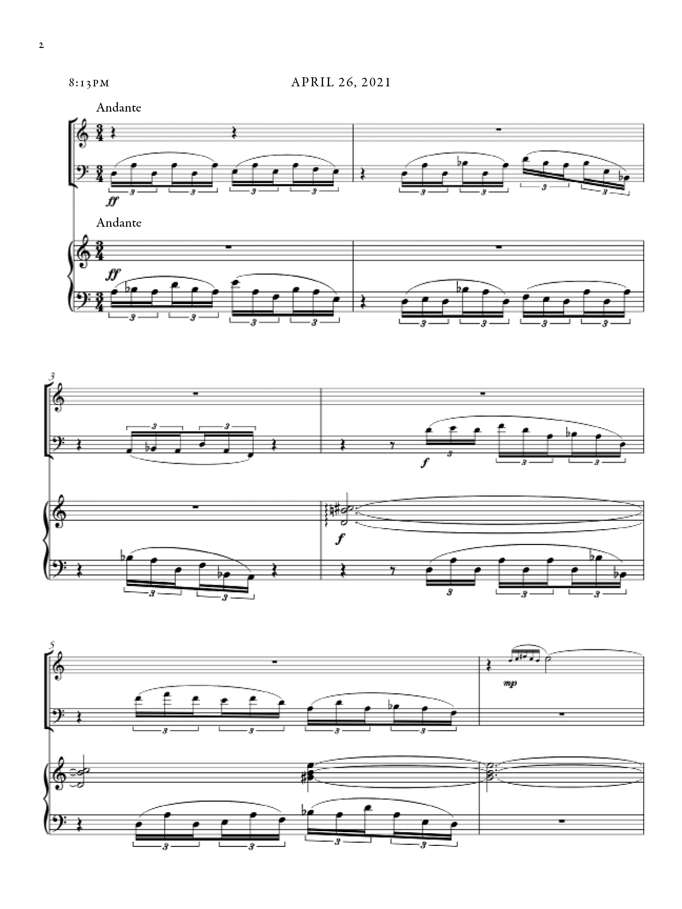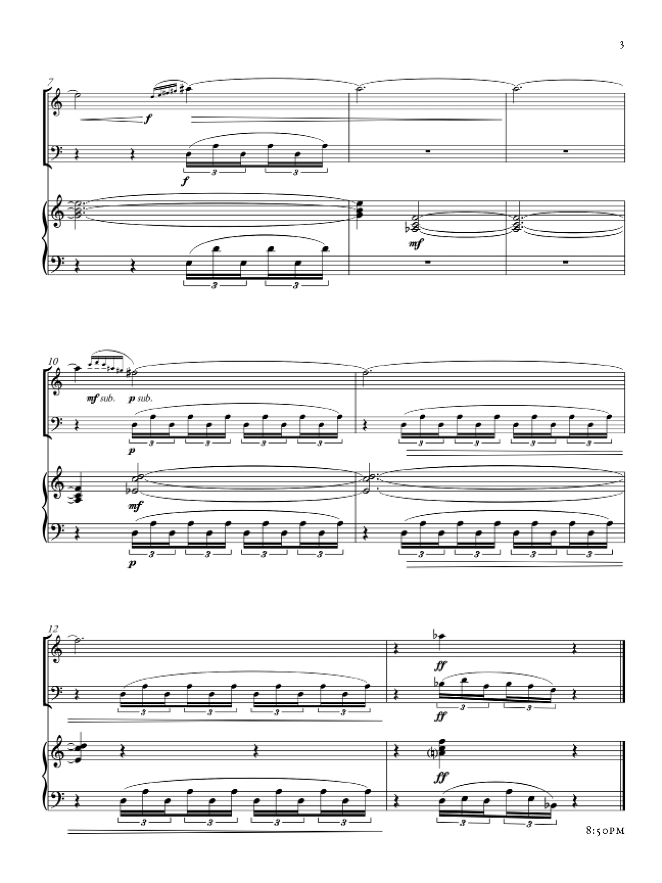 Each section of this piece shifts in character, as a reaction both to the night during which it was composed as well as my awareness of the existing sections up until that point. There are however common musical materials that draw throughlines across sections, from the beginning to the end of the piece. The music took inspiration from that of Marin Marais, traditional Japanese Koto music, and Olivier Messaien's Quatuor pour la fin du temps.